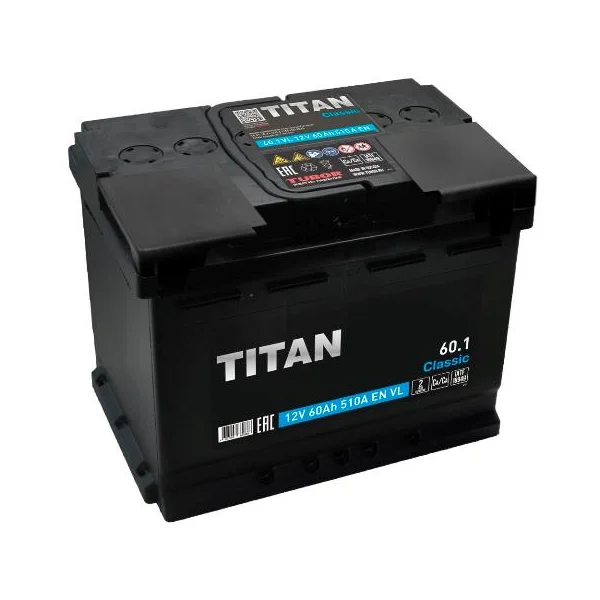 Представляем автомобильный Аккумулятор TITAN Classic 60Ah euro EN510, страна производитель которого: Россия. Этот аккумулятор обладает ёмкостью 60 А/ч и пусковым током 510 А, что обеспечивает надежный запуск автомобиля.